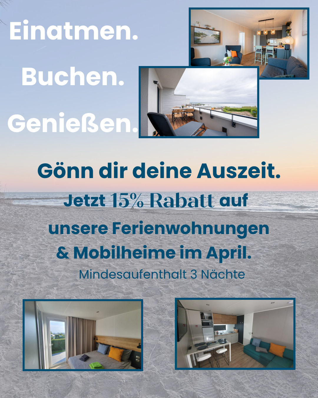 Kein Zelt oder Wohnwagen/-mobil? Kein Problem! Auf unserem Campingplatz direkt an der Ostsee kannst Du Dich auch eines unserer charmanten, modernen Mobilheime für 4-6 Personen mieten und beides genießen: Die Ungezwungenheit des Campens und den Luxus eines kleinen Ferienhauses. Neu seit Sommer 2025 sind unsere 4 Ferienwohnungen mit traumhaften Blick auf die Ostsee.
