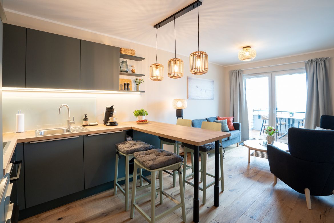 The apartments are lovingly furnished. A slightly steeper staircase leads to the apartment with a large hallway with storage space, two bedrooms with box-spring beds (1.60 m x 2 m) and a tasteful bathroom. The open-plan living and dining area with high-quality kitchen opens onto your private balcony – a retreat with a wonderful sea view. Enjoy the sweeping view of the Baltic Sea from the comfort of your bed or at breakfast.